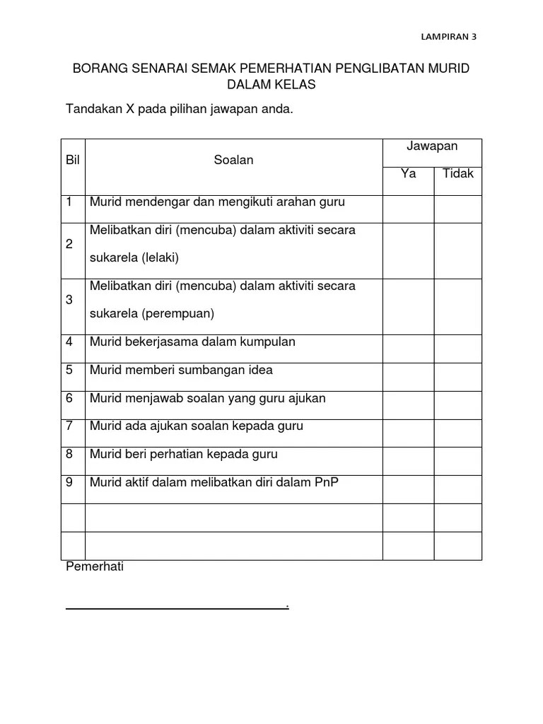 Posted by norasikin bt shamsudin. Borang senarai semak pemerhatian penglibatan murid dalam kelas. Bil.perkaratandakan ( / )catatanyatidak1.pengudaraan yang . Contoh borang standard prestasi perlaksanaan pentaksiran prasekolah pentaksiran. 4a kenali dan apresiasi warisan budaya malaysia bilangan pelajar : Senarai semak pemerhatian turut serta nama. Contoh senarai semak pemerhatian dalam kajian saya iaitu kaedah set dalam pengejaan perkataan bahasa melayu. ٩ ذو القعدة ١٤٤٣ هـ. Senarai semak pemerhatian rutin harian di prasekolah nama pelajar sekolah tarikh bil a. Disediakan lebih awal sebelum pemerhatian dibuat. Pm 3.0bertanggungjawab(pm 3.1.3) menjaga kebersihan, keselamatan harta benda sendiri dan kelas prasekolah.